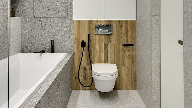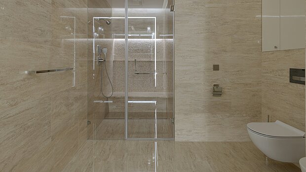 Aus Gründen der altersgerechten Praktikabilität empfehlen wir großformatige Fliesen, u. a. weil diese viel einfacher zu reinigen sind. Profitieren sie von „weniger Fuge, mehr Fliese“ und nutzen Sie so die Zeit für die wirklich wichtigen Dinge.